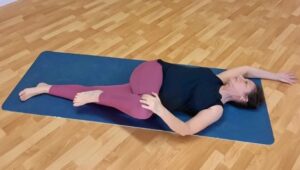 დაწექით ზურგზე გაშლილი ფეხებით. ამოისუნთქეთ და მარჯვენა მუხლი მკერდისკენ მიიტანეთ. მარცხენა ხელი მარჯვენა მუხლზე დადეთ და ფრთხილად მიიტანეთ მარჯვენა მუხლი მარცხენა მხარეს, თავი კი მარჯვნივ მოატრიალეთ. მხრები და ზურგის ზედა ნაწილი იატაკზე გეჭიროთ. გააჩერეთ 10 სუნთქვის განმავლობაში, შემდეგ კი მოეშვით და გაიმეორეთ იგივე მეორე მხარეს.